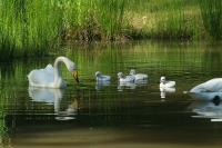 Schwäne zählen zu den Welt-Meistern der Monogamie; ein Schwanen-Paar bleibt sich lebennslang treu. Im vergangenen Jahr hat sich das Umkircher Singschwanen-Paar für die Geburt ihrer Jungen Christi Himmelfahrt ausgesucht. An diesem 40. Tag des Osterfestkreises feiern die Christen die Rückkehr Jesu Christi als Sohn Gottes zu seinem Vater in den Himmel. Nach 35 Brut-Tagen erblickten vier junge Singschwäne in Umkirch das Licht der Welt. Wie der Name schon sagt, kann der Singschwan ausdrucksvoll singen. Aus dieser Eigenschaft leitet sich seit der Antike die metaphorische Gleichsetzung des Schwans mit dem Dichter her. Singschwäne sind auch auf der finnischen 1-Euro-Münze abgebildet. Die Singschwäne (Wissenschaftlicher Name Cygnus cygnus) gehören zur Familie der Entenvögel in der Gattung der Schwäne. Es sind Brutvögel der osteuropäischen und sibirischen Taiga. In Umkirchs Queen-Auguste-Victoria-Park wurden vor rund 15 Jahren zwei Pärchen Singschwäne ausgesetzt. Sie brachten inzwischen zahlreiche Jungen zur Welt. Jedes Jahr werden die Jungschwäne (wenige Tage nach ihrer Geburt) schon Opfer von Raubvögeln. Im letzten Jahr hat nur ein Jungschwan überlebt. Dennoch ist das Ensemble des Umkircher "Singschwan-Orchesters" in den letzten Jahren auf insgesamt 12 Mitglieder (Singschwäne) angestiegen. Nachdem Park-Fotograf Achim Keller die Schwäne aufgenommen hatte beobachtete auch Singschäne-Fotograf Werner Trageiser Umkirchs Entenvögel; es gelangen ihnen erstaunliche Schnappschüsse.