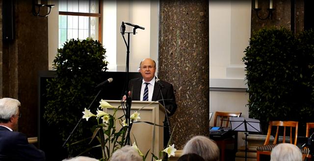 Freiburgs Erster Bürgermeister Otto Neideck spricht zur Sepulkralkultur à la Freiburg im schönsten Friedhofs-Dom Deutschlands. (Bild: Musevita)