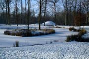 Harmonie der Gartenkunst im Queen-Auguste-Victoria-Park: Der Erdkegel hinter einem zugefrorenen Schlossteich (Bild: Musevita) |